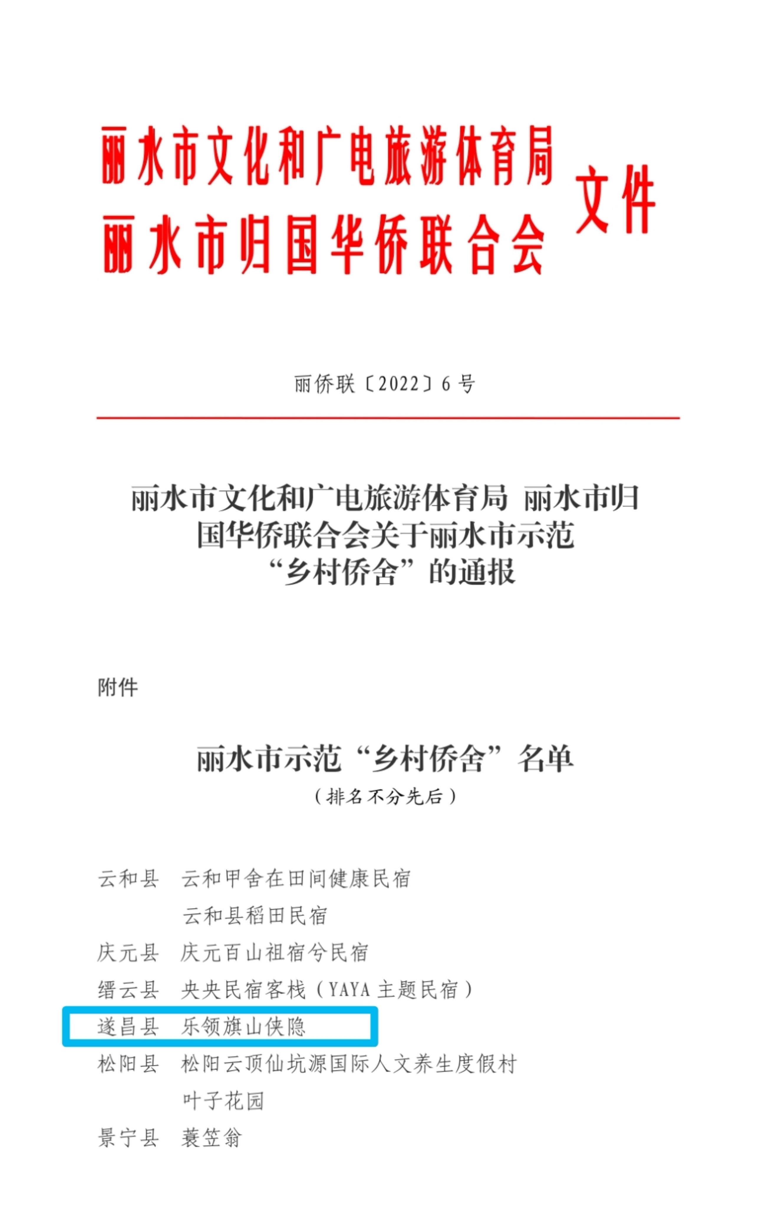 近日,從麗水市文化和廣電旅游體育局、麗水市歸國華僑聯(lián)合會發(fā)布的《關(guān)于麗水市示范“鄉(xiāng)村僑舍”的通報》中獲悉,深圳樂領(lǐng)生活發(fā)展有限公司旗山俠隱莊園作為遂昌縣唯一入選單位,榮獲麗水市示范“鄉(xiāng)村僑舍”稱號。