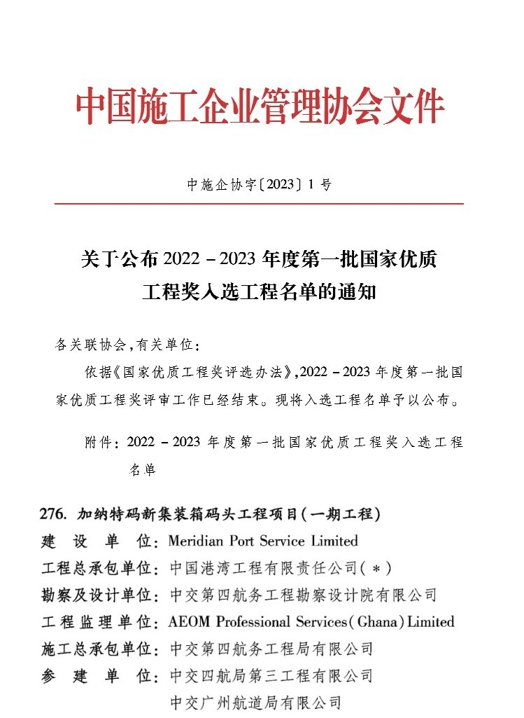 近日,從中國(guó)施工企業(yè)管理協(xié)會(huì)官方網(wǎng)站發(fā)布的《關(guān)于公布2022-2023年度第一批國(guó)家優(yōu)質(zhì)工程獎(jiǎng)入選工程名單的通知》中獲悉,深圳市蛇口招商港灣工程有限公司參建的加納特碼新集裝箱碼頭項(xiàng)目(一期工程)榮獲2022-2023年度國(guó)家優(yōu)質(zhì)工程獎(jiǎng)。