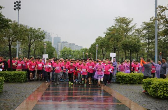 浩浩蕩蕩起跑隊(duì)伍漸漸的拉開距離,如果站在高處俯視整個深圳灣運(yùn)動公園,你會發(fā)現(xiàn)整個深圳灣北岸的跑道上都遍布著粉紅色跳動的精靈。雨水夾雜著汗水,由發(fā)頂流過眉心流至眼眸,縱然艱辛,但是招港人選擇了遠(yuǎn)方便只顧風(fēng)雨兼程!