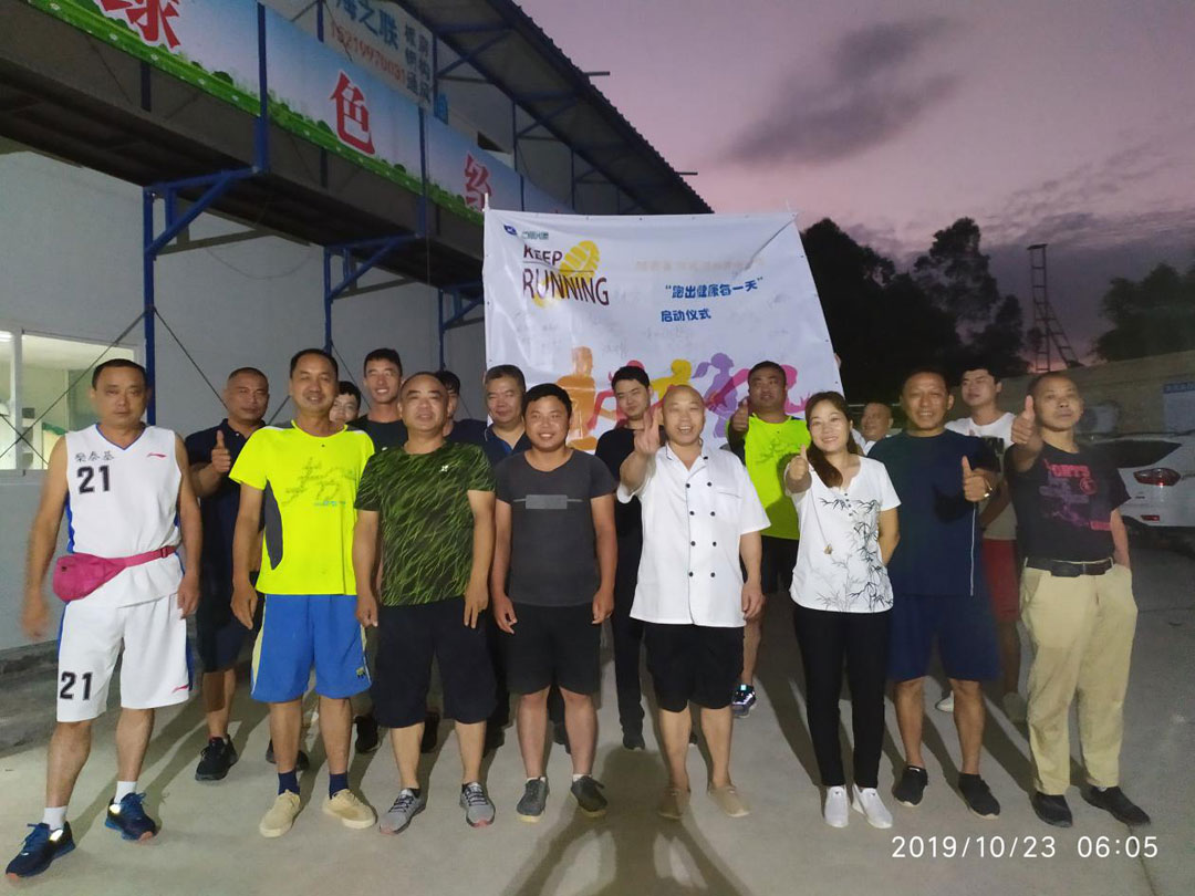 公司生產(chǎn)部副經(jīng)理楊永輝帶領(lǐng)大家進行跑前熱身后,伴隨著鄒總的開跑號令,晨跑正式開始。一路上,迎著涼爽的晨風(fēng),個個精神飽滿,在奔跑中鳴奏青春的旋律,抒寫人生健身樂章,全員均順利完成了5公里的晨跑里程。