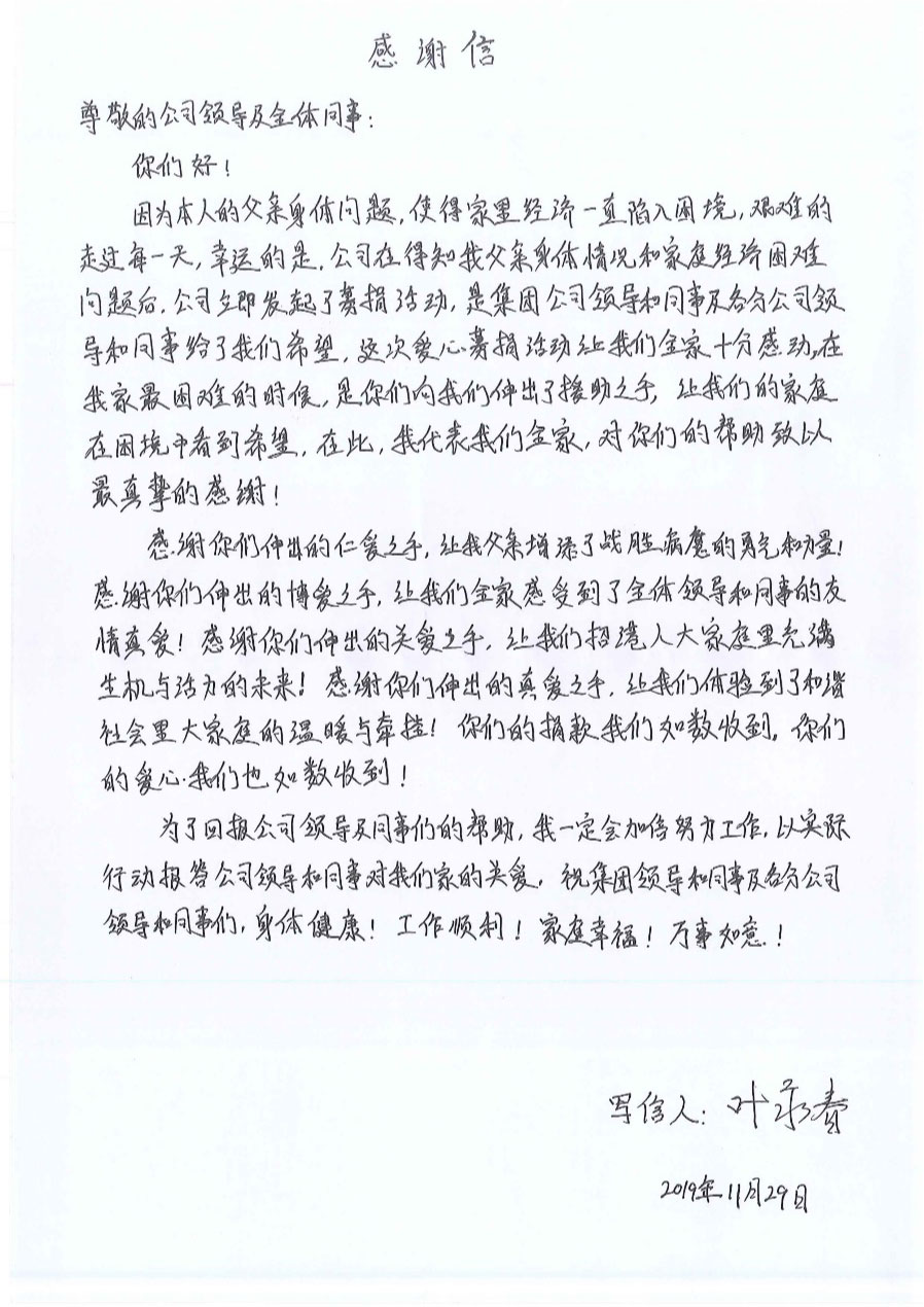 現(xiàn)場(chǎng)舉行了簡(jiǎn)單的捐助儀式,葉永春代表家人對(duì)公司領(lǐng)導(dǎo)和同事們的愛(ài)心捐助表示感謝,并將寫(xiě)著“招港待人如親關(guān)懷 真情體現(xiàn)親如一家”的錦旗贈(zèng)予集團(tuán),他還手寫(xiě)了一封致公司領(lǐng)導(dǎo)及全體同事的感謝信。