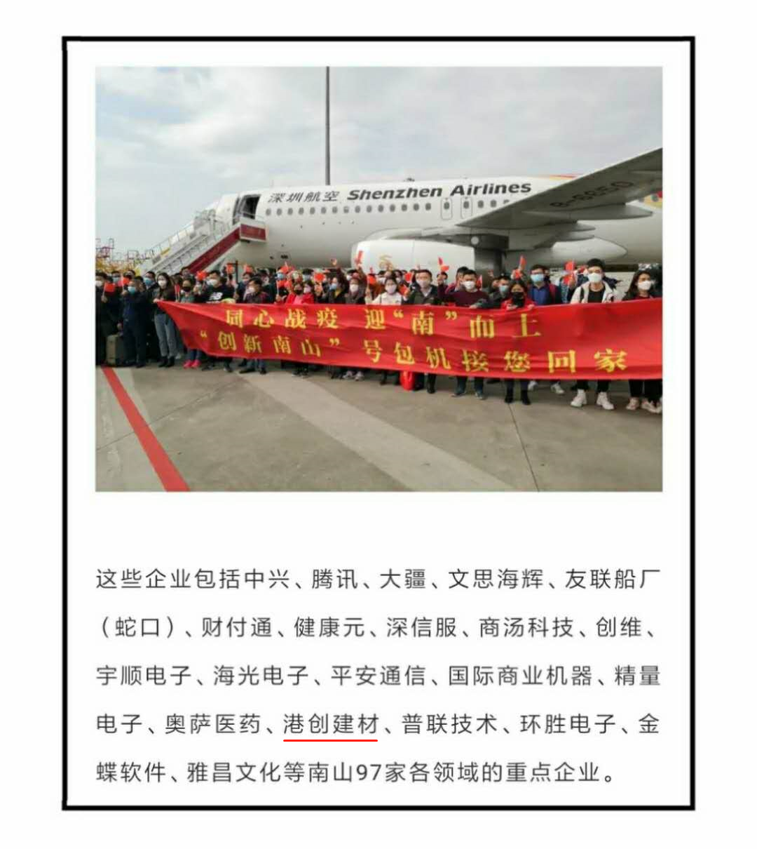 2月27日下午,深圳港創(chuàng)建材股份有限公司部分成都、西安員工搭乘由深圳市南山區(qū)組織支持企業(yè)復(fù)工復(fù)產(chǎn)的“創(chuàng)新南山”號(hào)包機(jī)返回深圳。